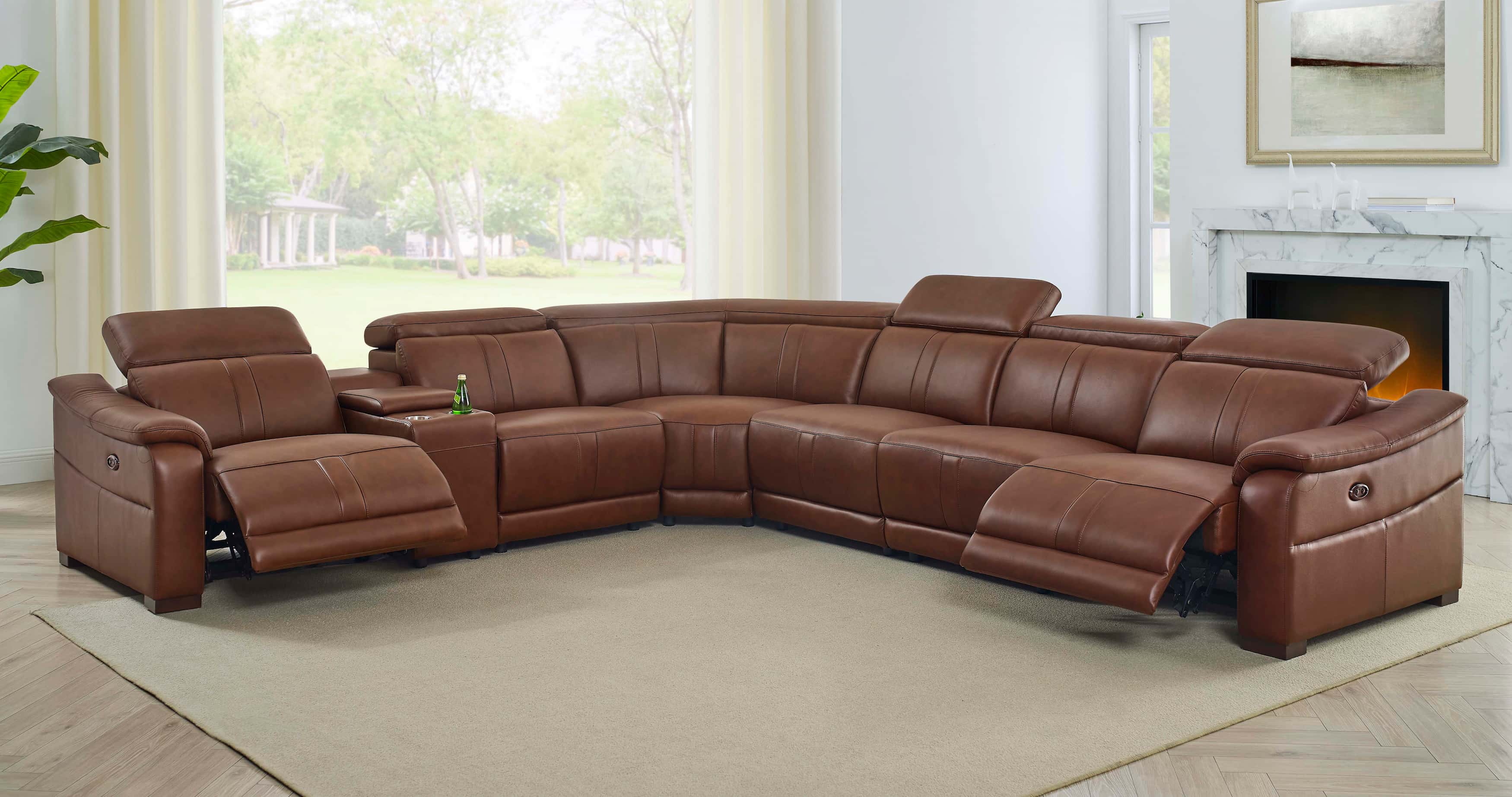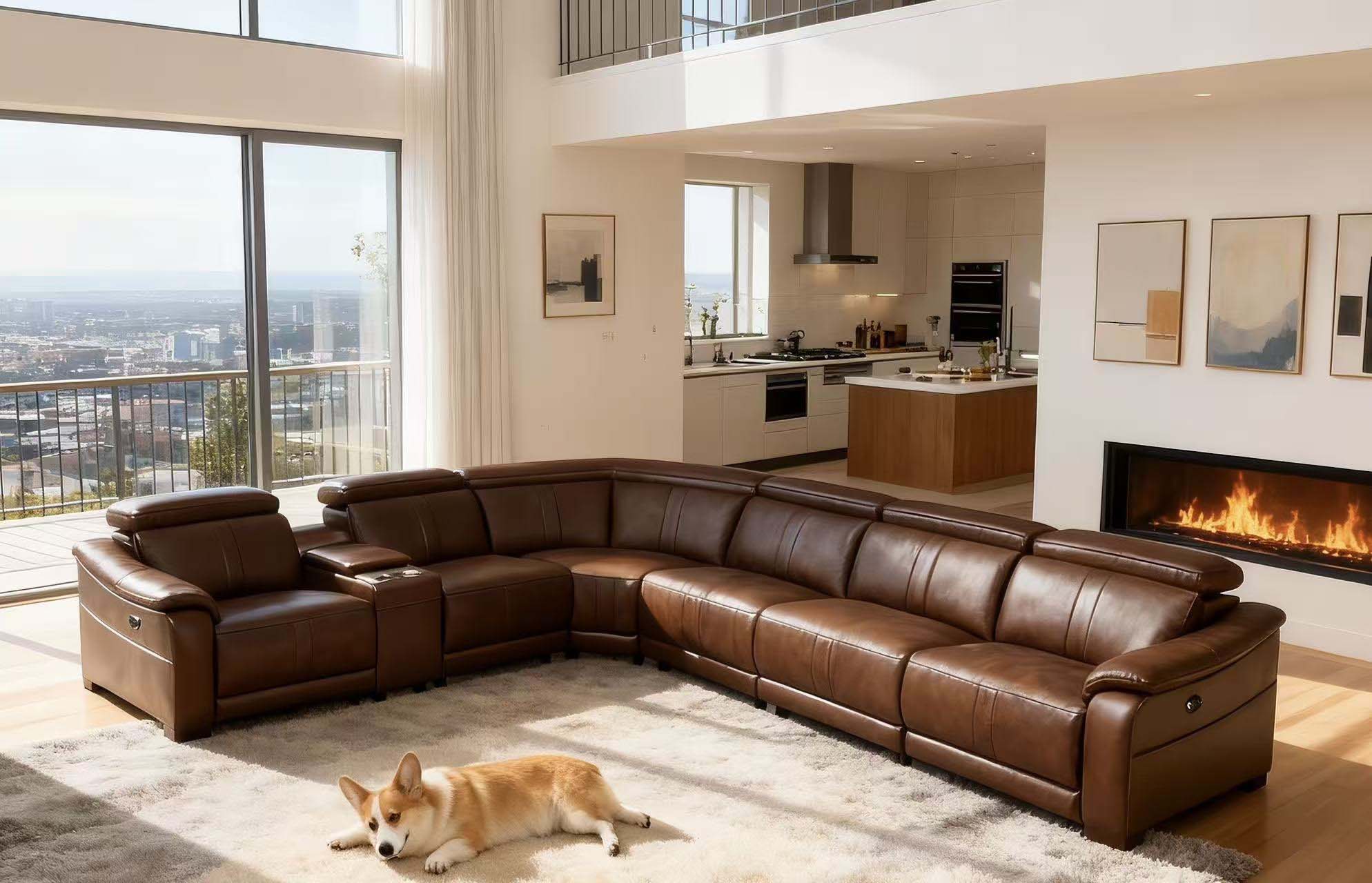 5, With its expansive L-shaped silhouette and warm amber tones, this centerpiece seamlessly anchors grand living spaces with effortless elegance.