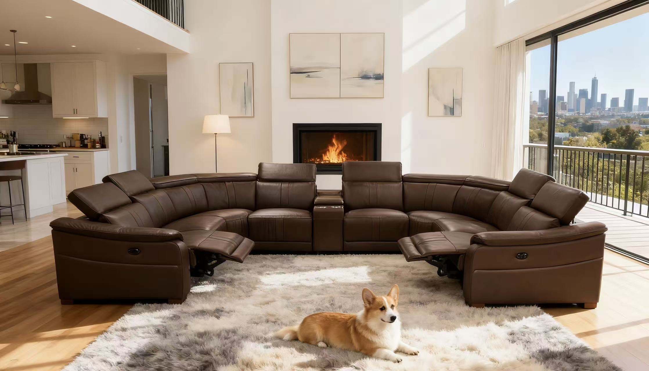 1, The -9 configuration masterfully integrates a multi-functional storage console into its grand U-shape, blending massive seating with high-end convenience.