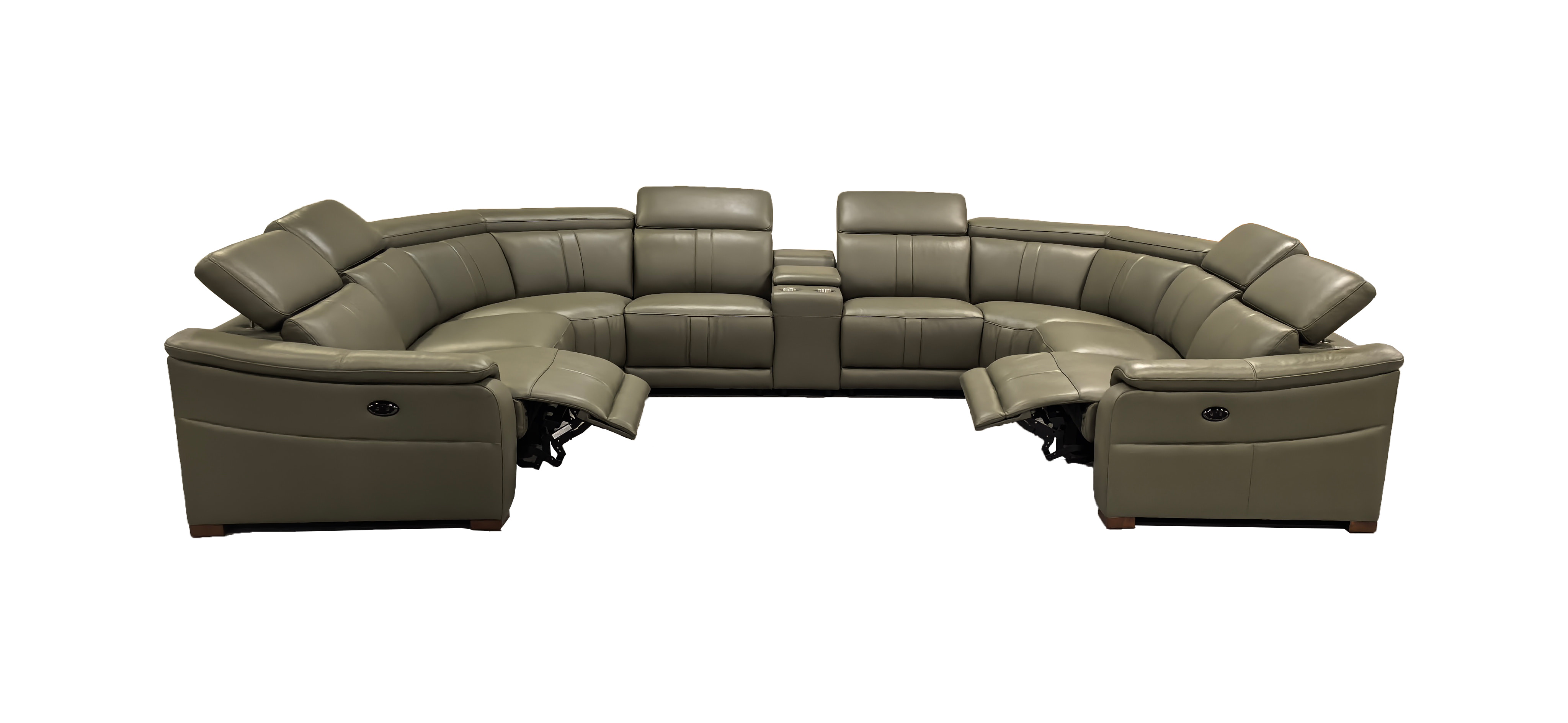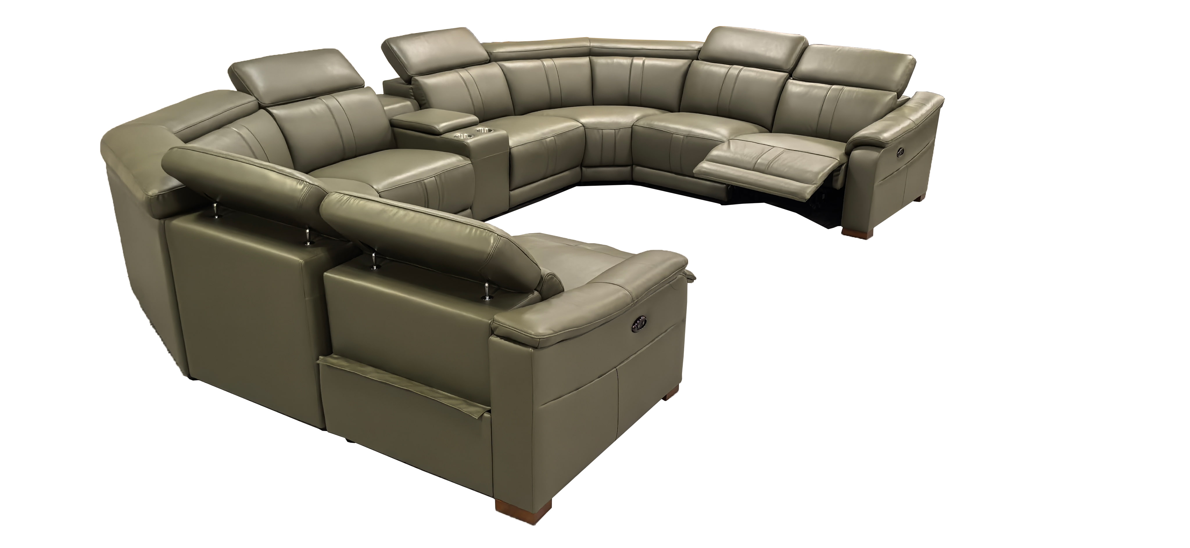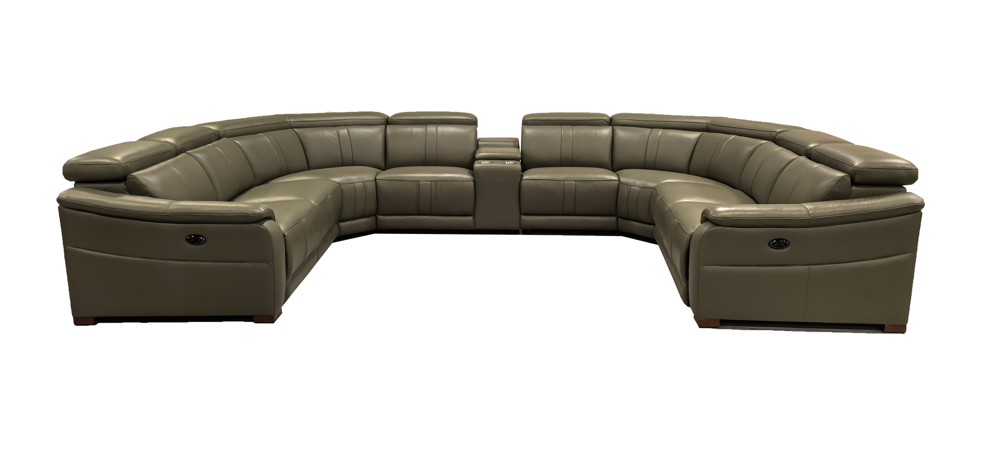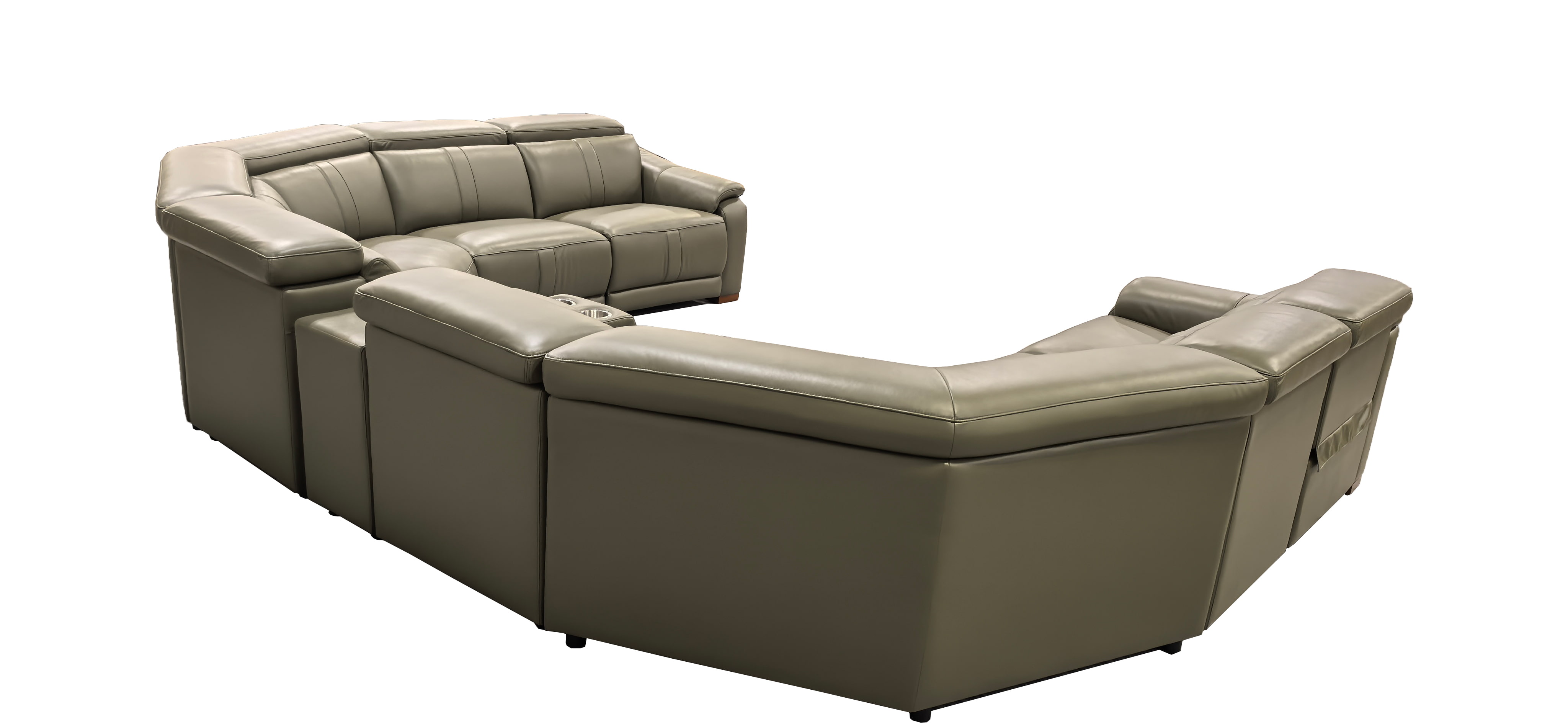 1, The -9 configuration masterfully integrates a multi-functional storage console into its grand U-shape, blending massive seating with high-end convenience.