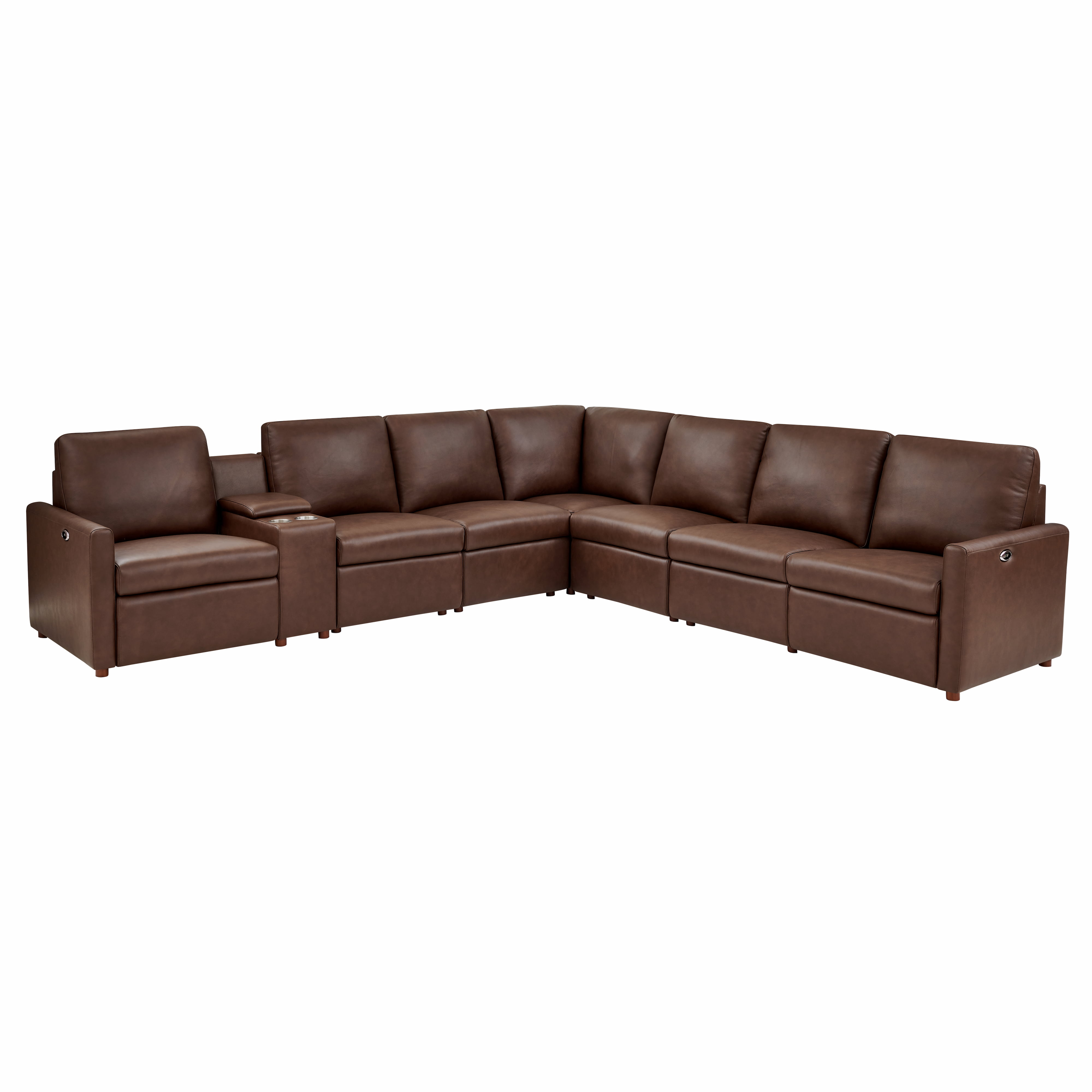 • Optioned Storage Console: Deep storage compartment and built-in cupholders for ultimate theater-style convenience.