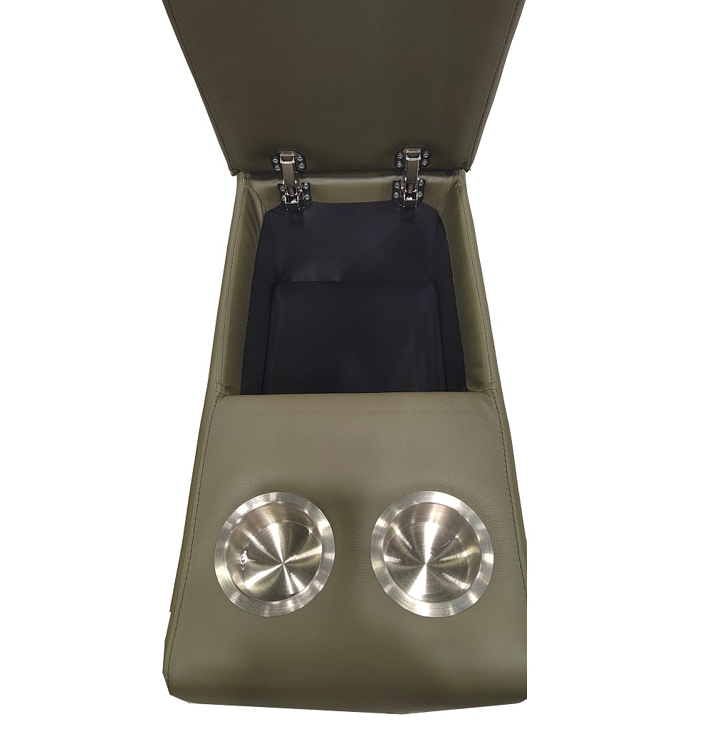 4, The integrated storage console features dual stainless steel cupholders and a deep compartment.