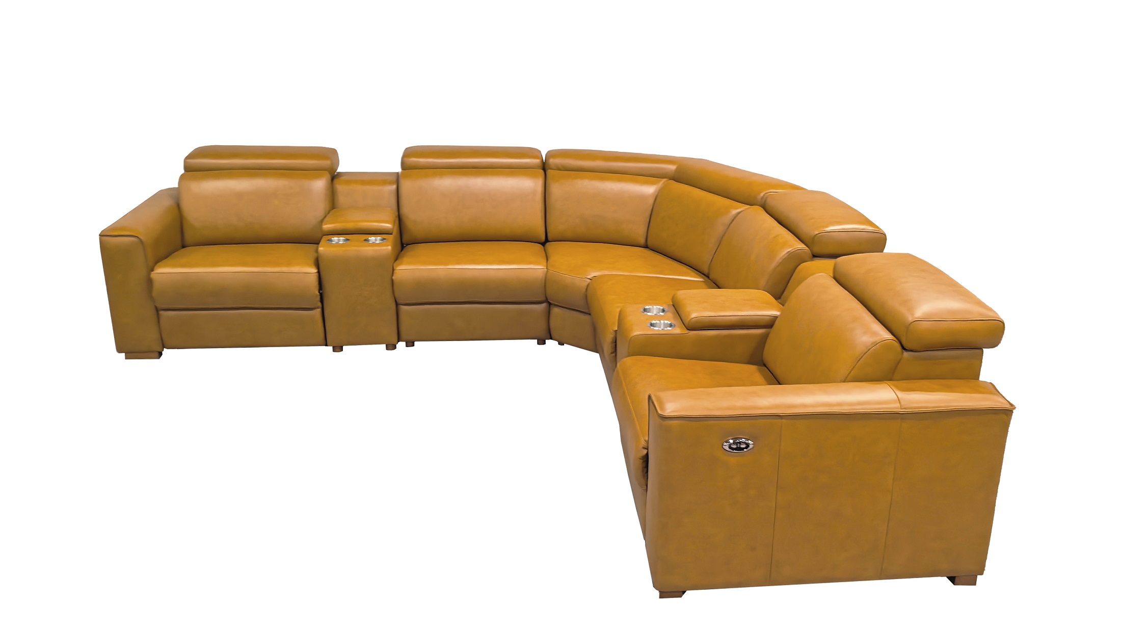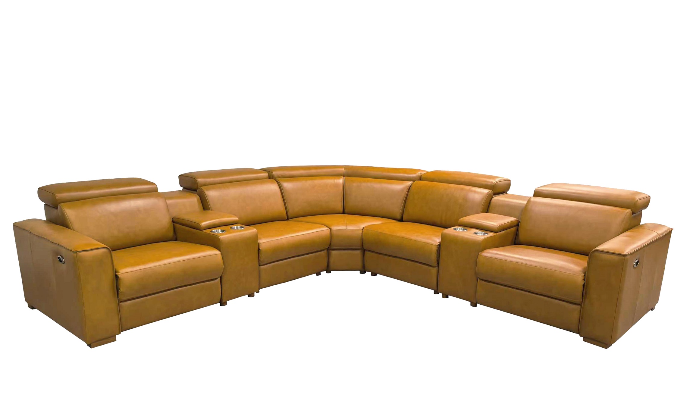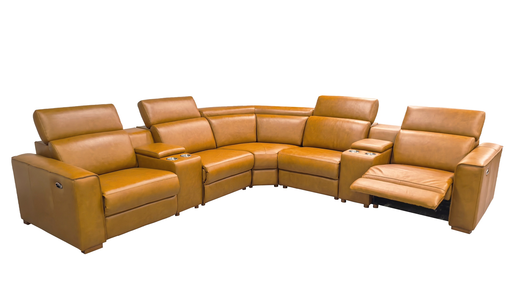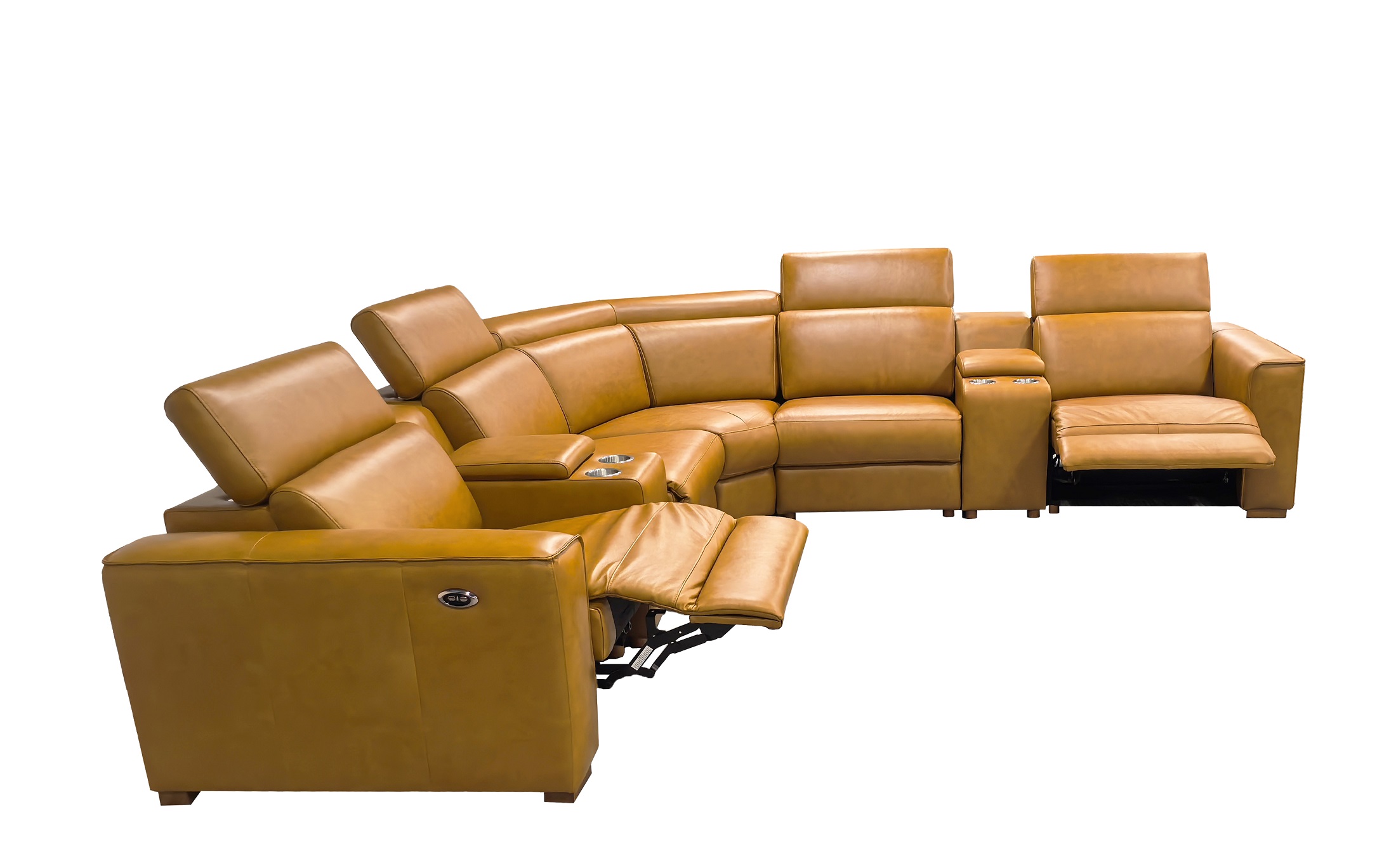 4, The end seats feature power reclining mechanisms, while other module is equipped with an adjustable manual headrest for personalized neck support.