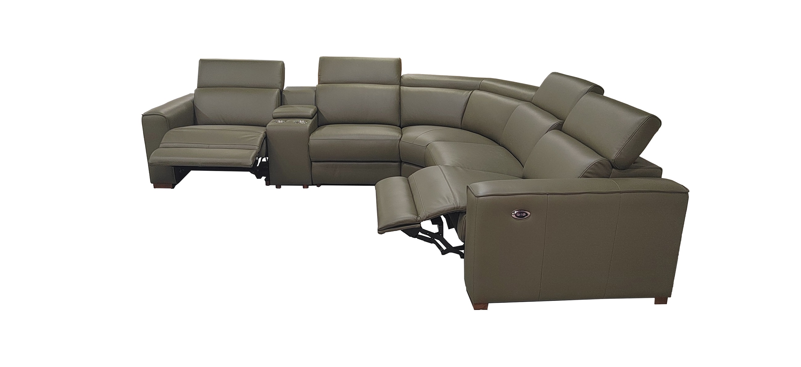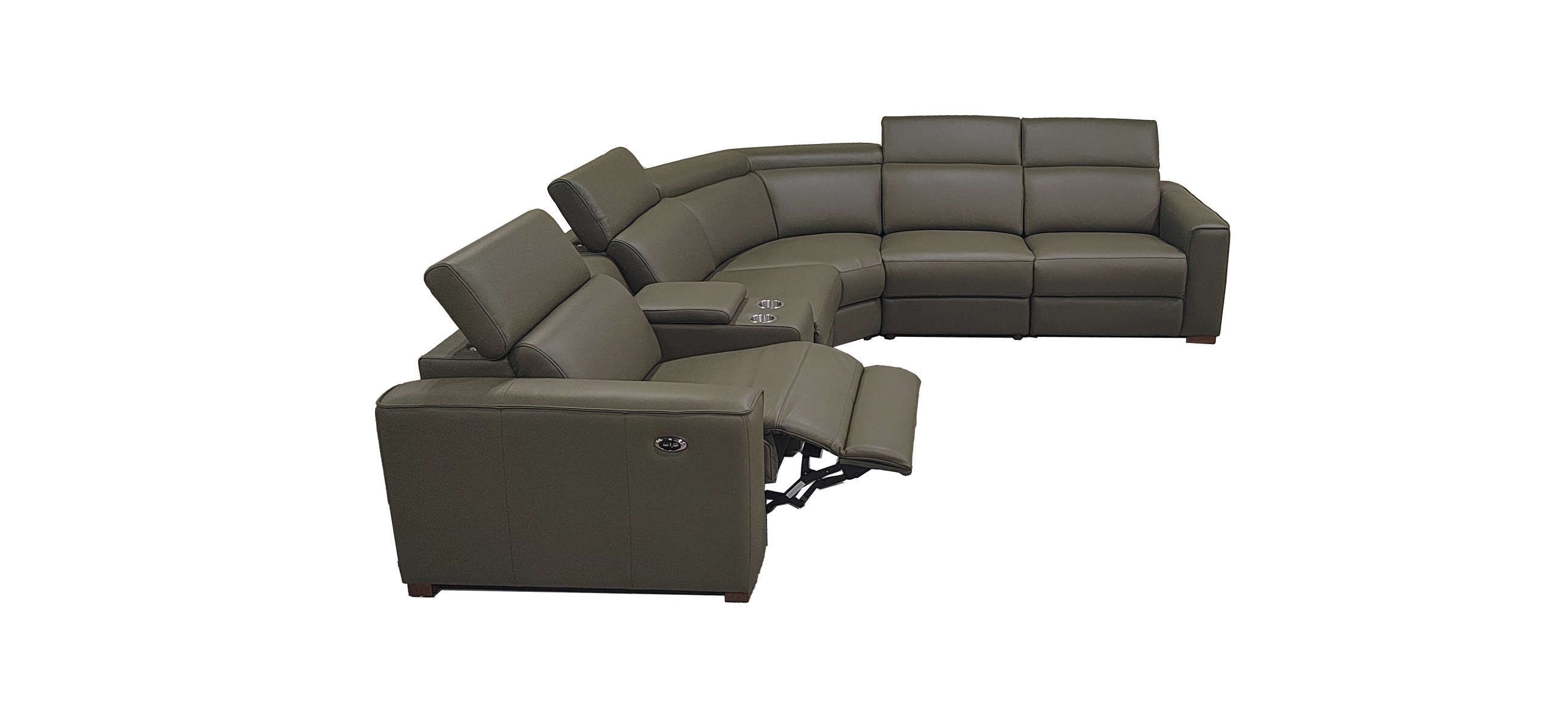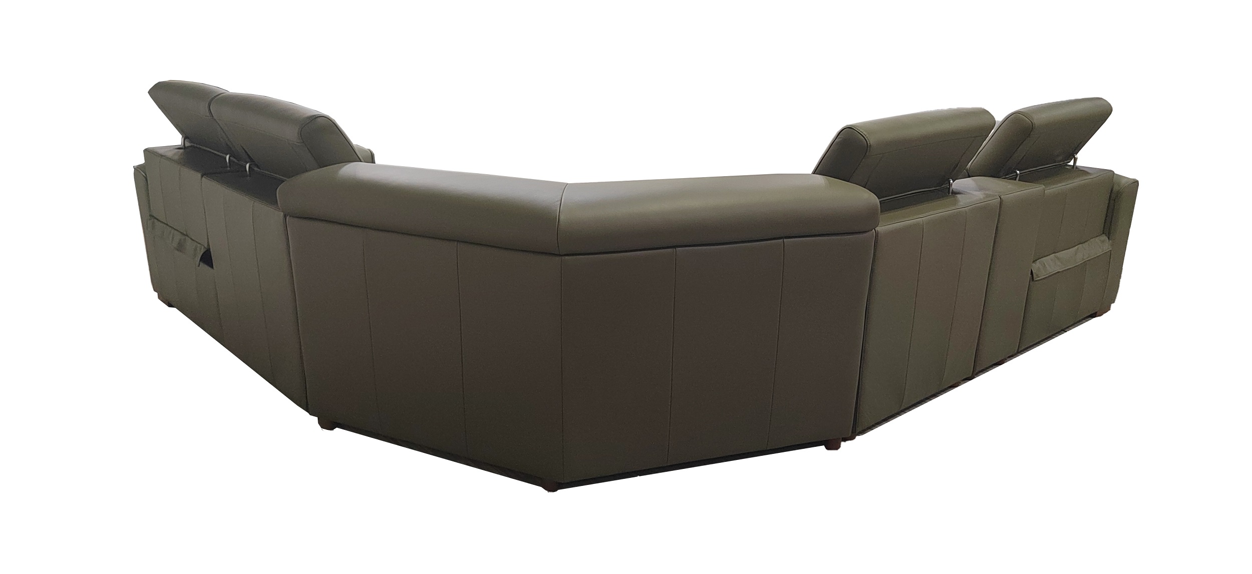 4, The end seats feature power reclining mechanisms, while other module is equipped with an adjustable manual headrest for personalized neck support.