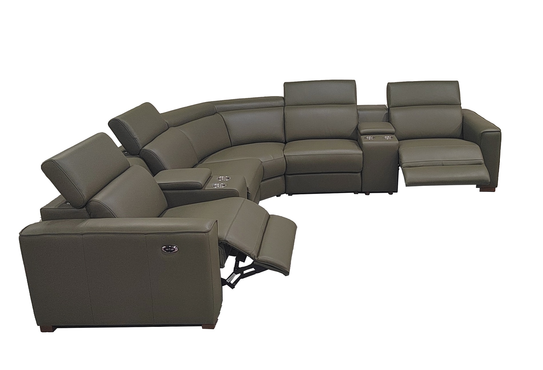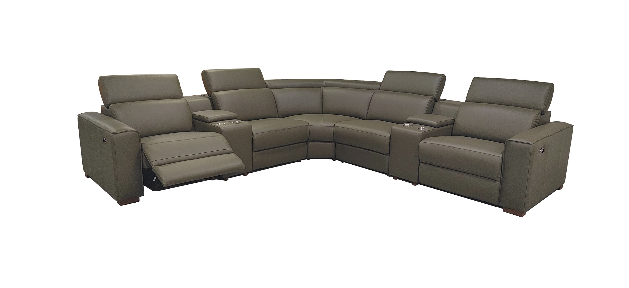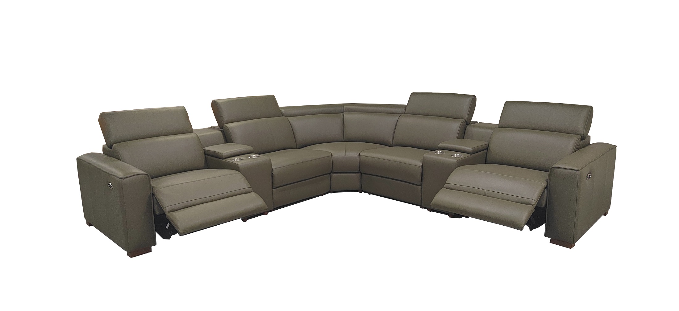 4, The end seats feature power reclining mechanisms, while other module is equipped with an adjustable manual headrest for personalized neck support.
